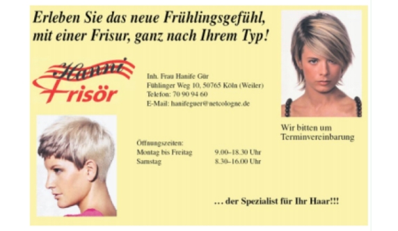 Hanni Frisör ist Ihr kreativer Partner für Haarstylings und Schönheitspflege im Herzen von Köln Weiler. Mit einem engagierten Team von erfahrenen Friseuren bieten wir eine entspannte Atmosphäre und maßgeschneiderte Dienstleistungen für jeden Kunden. Unser Ziel ist es, Ihre individuellen Wünsche und Vorstellungen in stilvolle Looks umzusetzen, die Ihre Persönlichkeit unterstreichen.